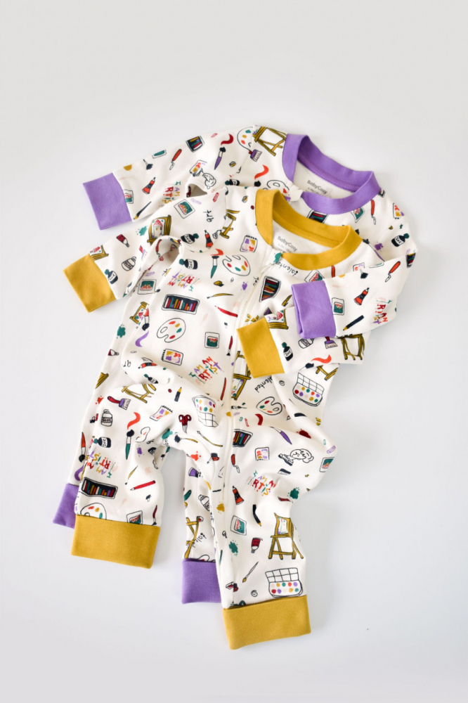 Set 2 salopetele din bumbac organic cu maneca lunga si fermoar Galben si Mov 12-18 Luni
