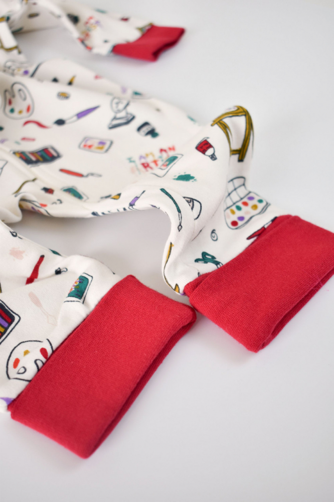 - Este realizat din bumbac organic 100% - material certificat GOTS, delicat cu pielea gingasa a a bebelusului. Printurile sunt cu vopseluri pe baza de apa si toate produsele sunt in concordanta cu standardele GOTS.