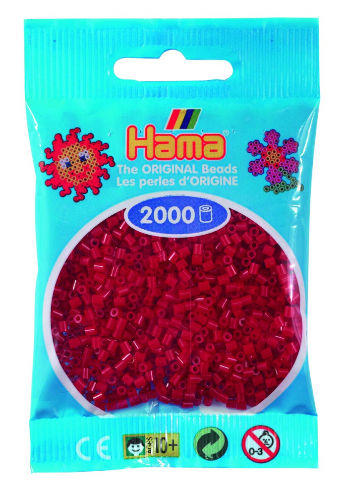 Conține: aproximativ 2.000 de bucăți mărgele HAMA MINI roșu închis, împachetate într-o sacoșă de plastic transparent și colorat.