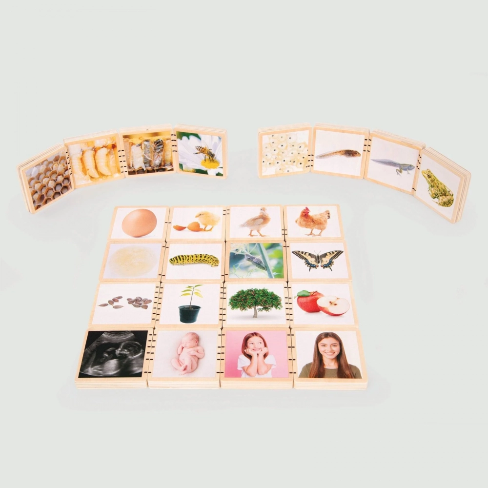 Cu fotografii color de înaltă definiție imprimate pe o parte, fiecare plăcuță ilustrează frumos etapele de dezvoltare ale procesului de creștere în ciclul de viață al oamenilor, albinelor, broaștelor, merelor, fluturilor și găinilor.