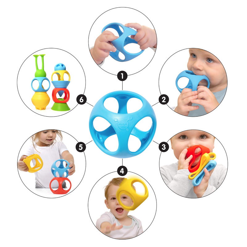 - Ca toate jucariile MOLUK, Oibo creste odata cu copiii! Usor de prins si manevrat de catre bebelusi, cuburile-sferice pot fi introduse inca de la nastere si sunt minunate ca jucarii de dentitie, fiind execelente pentru a alina durerile gingivale ale micutilor. Pe masura ce copiii cresc, si abilitatile lor motorii se imbunatatesc, vor fi incantati sa le foloseasca ca blocuri de constructie tactile, sa le stivuiasca, rostogoleasca, precum si sa invete sa le arunce si sa le prinda.