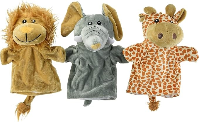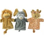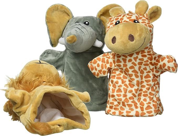 Acest set include trei marionete de mână reprezentând un elefant, o girafă și un leu, fiecare având o înălțime de 28 cm și fiind confecționată din stofă de calitate.
