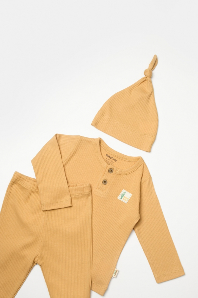 Set 3 piese bluza, pantaloni si caciulita Bamboo, maro, BabyCosy, 50% bumbac + 50% bambus, marime 18-24 Luni