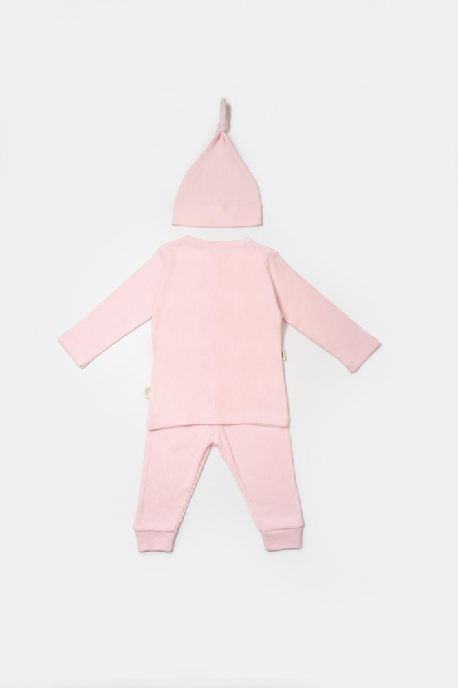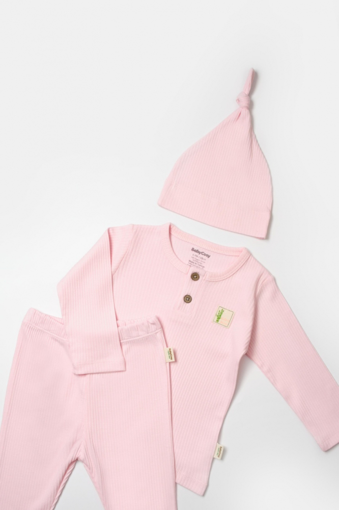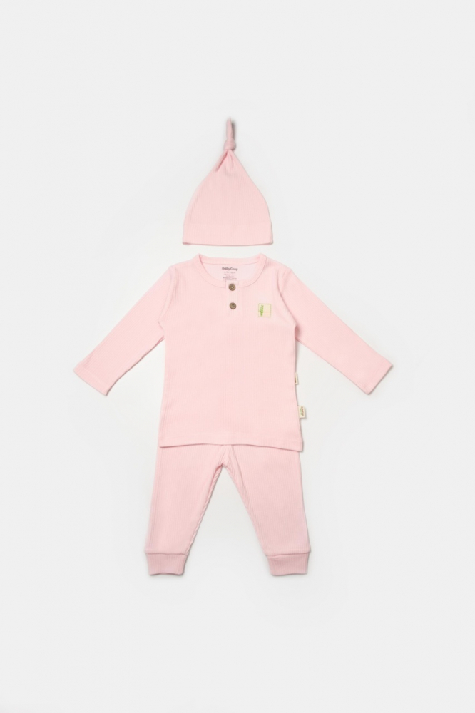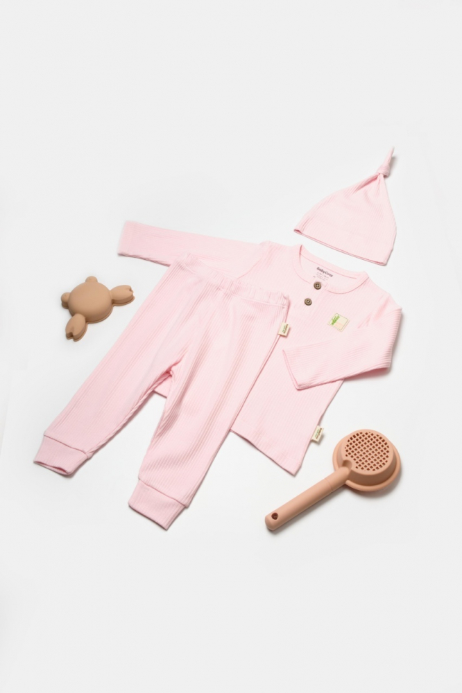 Set 3 piese bluza, pantaloni si caciulita Bamboo, roz, BabyCosy, 50% bumbac + 50 % bambus, marimea 18-24 Luni