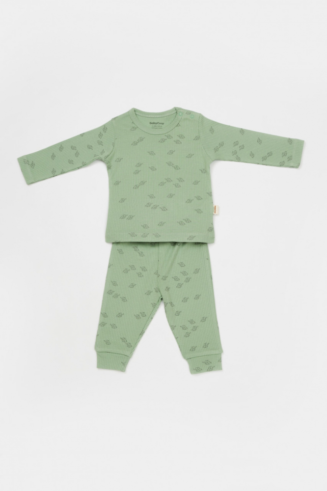 Set 3 piese bluza pantaloni si caciulita Printed BabyCosy 50% modal+50% bumbac Verde 18-24 Luni