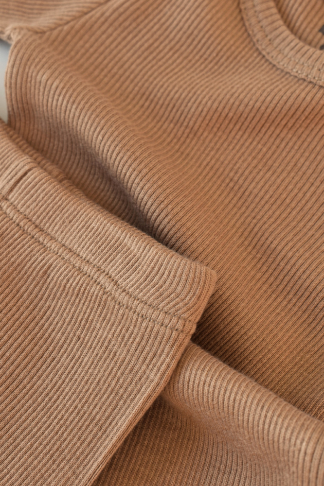 Set 3 piese body cu maneca lunga pantaloni cu botosei si caciulita din bumbac organic si modal Maro 3-6 Luni