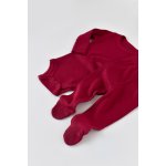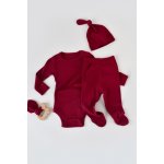 Set 3 piese body cu maneca lunga pantaloni cu botosei si caciulita din bumbac organic si modal Rosu 3-6 Luni