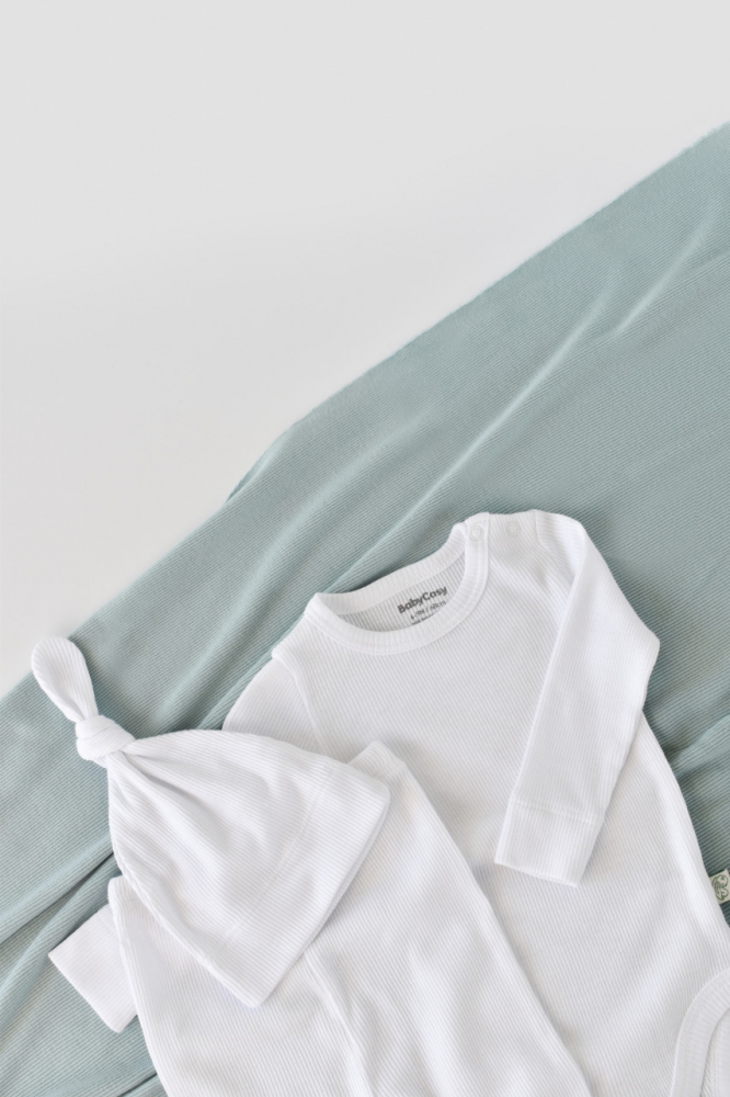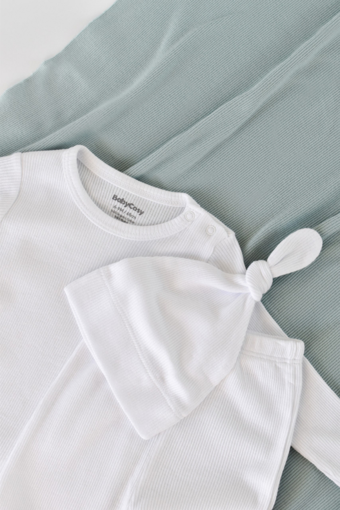 Set 3 piese body cu maneca lunga pantaloni si caciulita din bumbac organic si modal Alb 9-12 luni