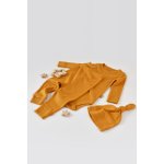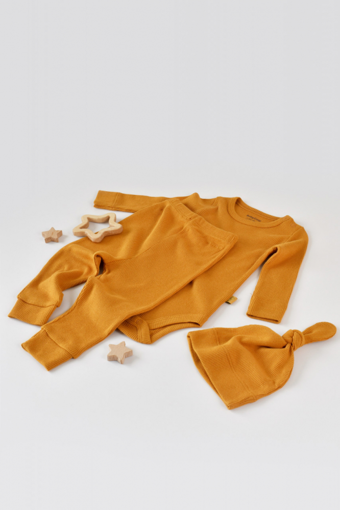 Set 3 piese body cu maneca lunga pantaloni si caciulita din bumbac organic si modal Mustar 9-12 luni