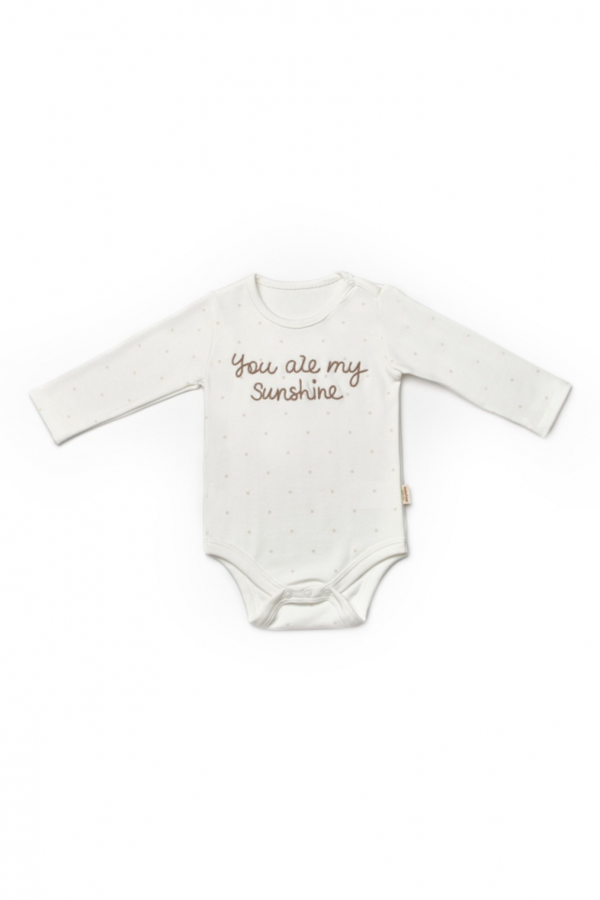 2. Body-ul cu maneci lungi, din 100% bumbac organic, se inchide cu capse intre picioruse si la umar.