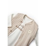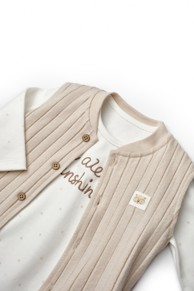 Setul format din 3 piese cu body, pantalonasi si vestuta este perfect pentru orice anotimp. Acest model este potrivit atat pentru fetite, cat si pentru baieti.