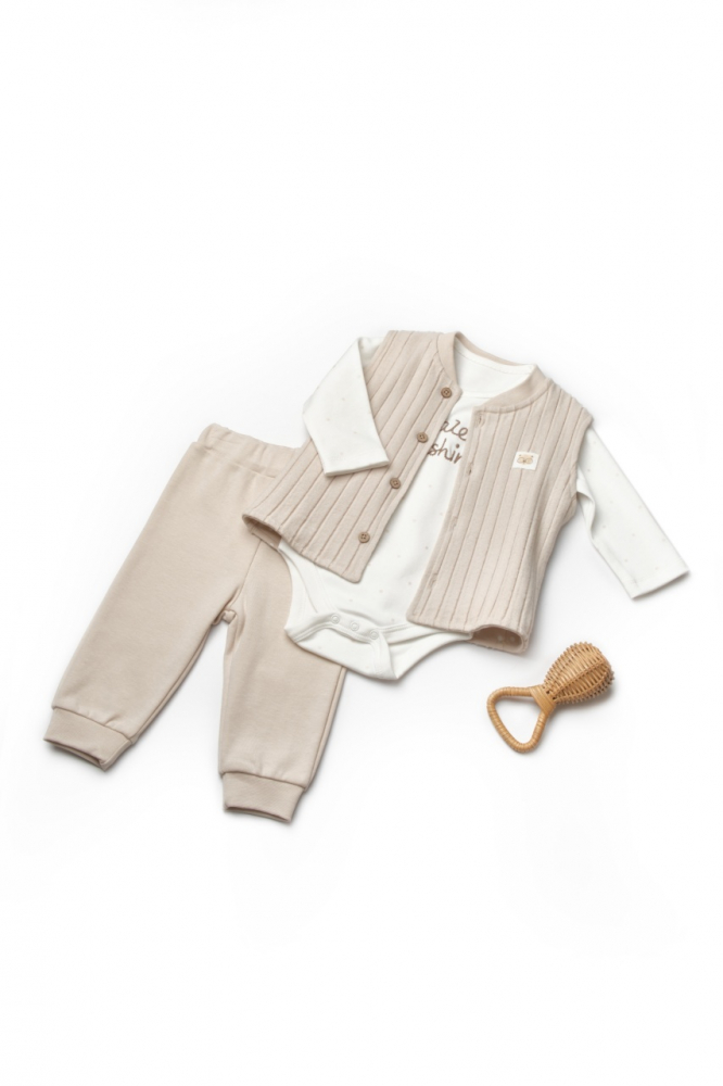Setul format din 3 piese cu body, pantalonasi si vestuta este perfect pentru orice anotimp. Acest model este potrivit atat pentru fetite, cat si pentru baieti.