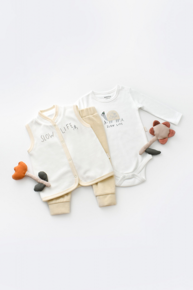 Set 3 piese Broscuta cu body pantalonasi si vestuta Baby Cosy din 80% bumbac organic si 20% poliester Crem 6-9 luni
