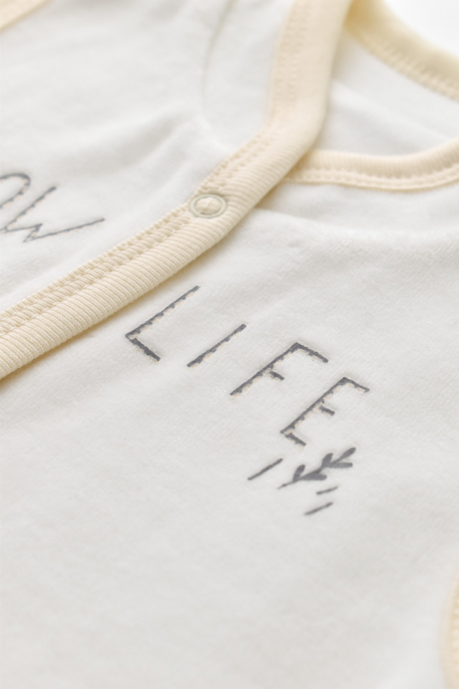 2. Body-ul cu maneci lungi, din 100% bumbac organic, se inchide cu capse intre picioruse si la umar.