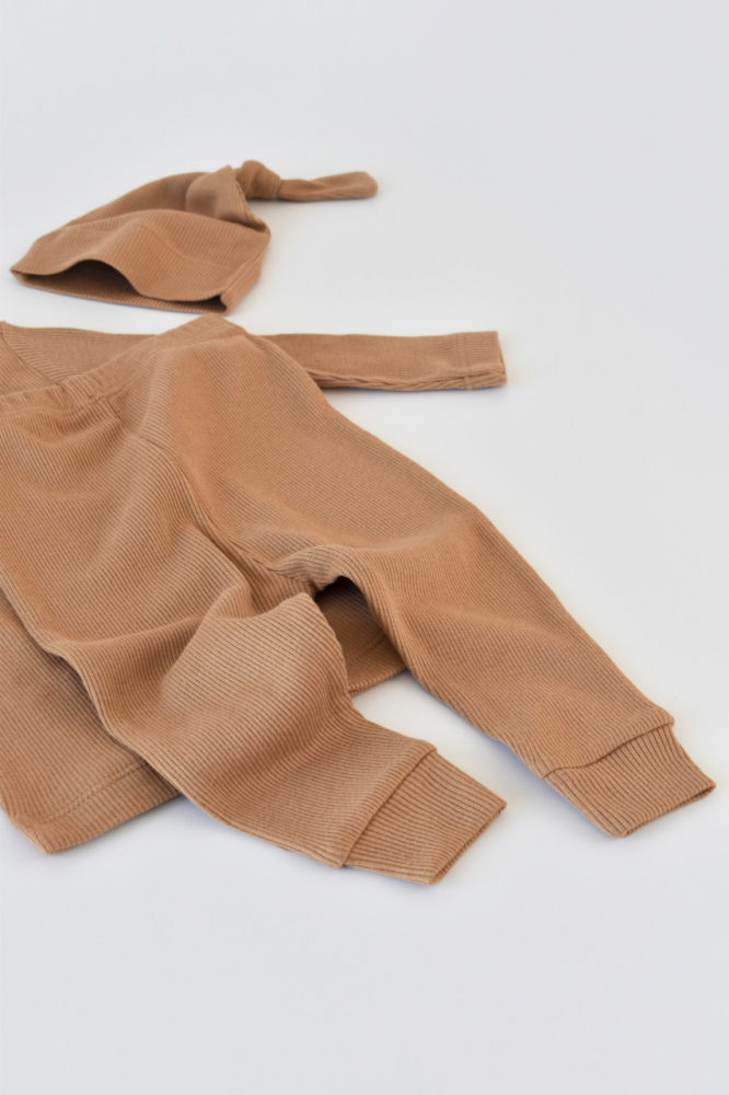Set 3 piese cu bluzita pantaloni si caciulita din bumbac organic si modal Maro 6-9 luni