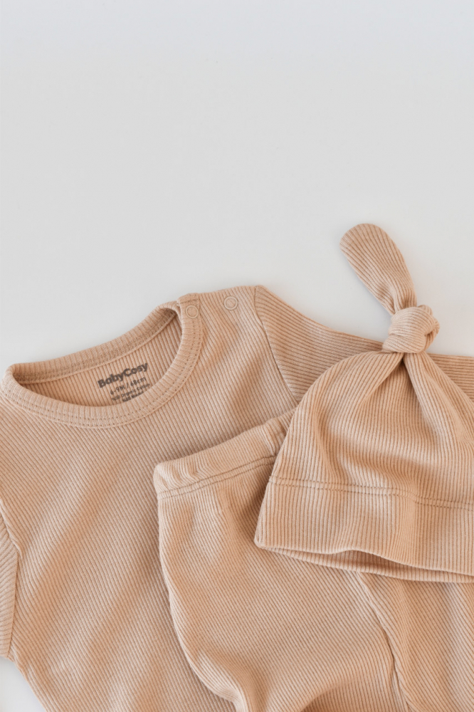 Set 3 piese cu bluzita pantaloni si caciulita din bumbac organic si modal Somon 9-12 luni