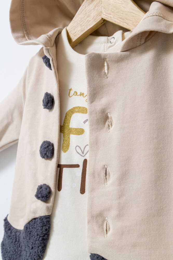 Set compus din 3 piese: pantaloni, bluzita si hainuta cu gluga eleganta pentru bebelusi reprezinta o combinatie de design spectaculos si confort absolut.