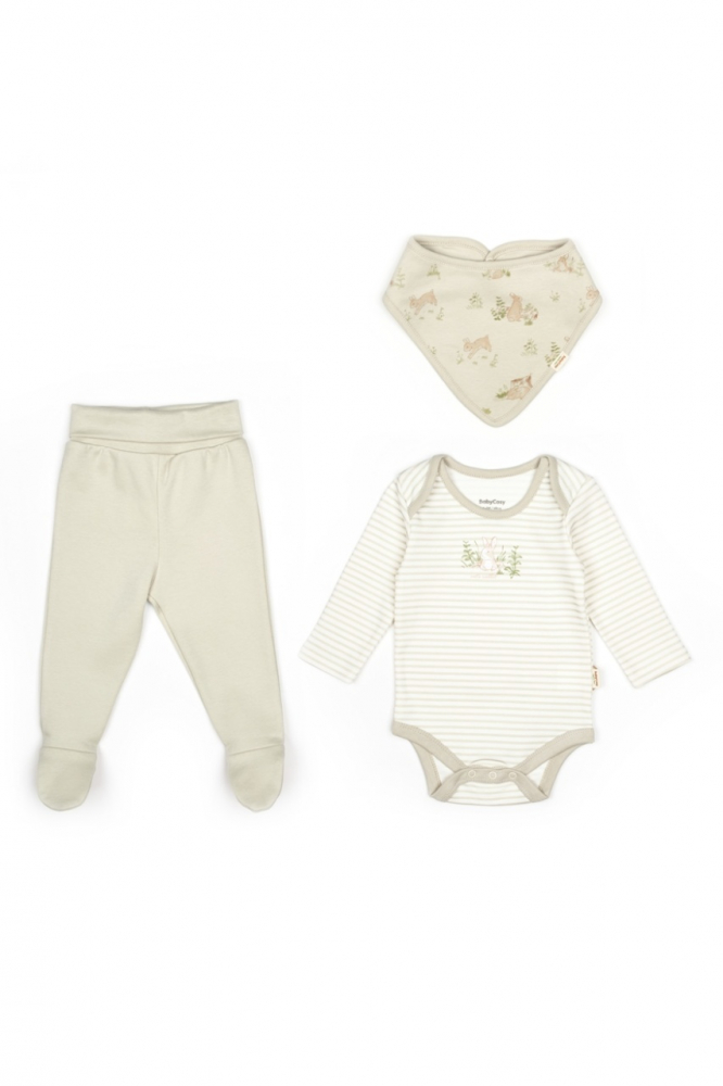 Set 3 piese:body, pantaloni si baveta Rabbit, BabyCosy, 100% bumbac, marime 3-6 Luni