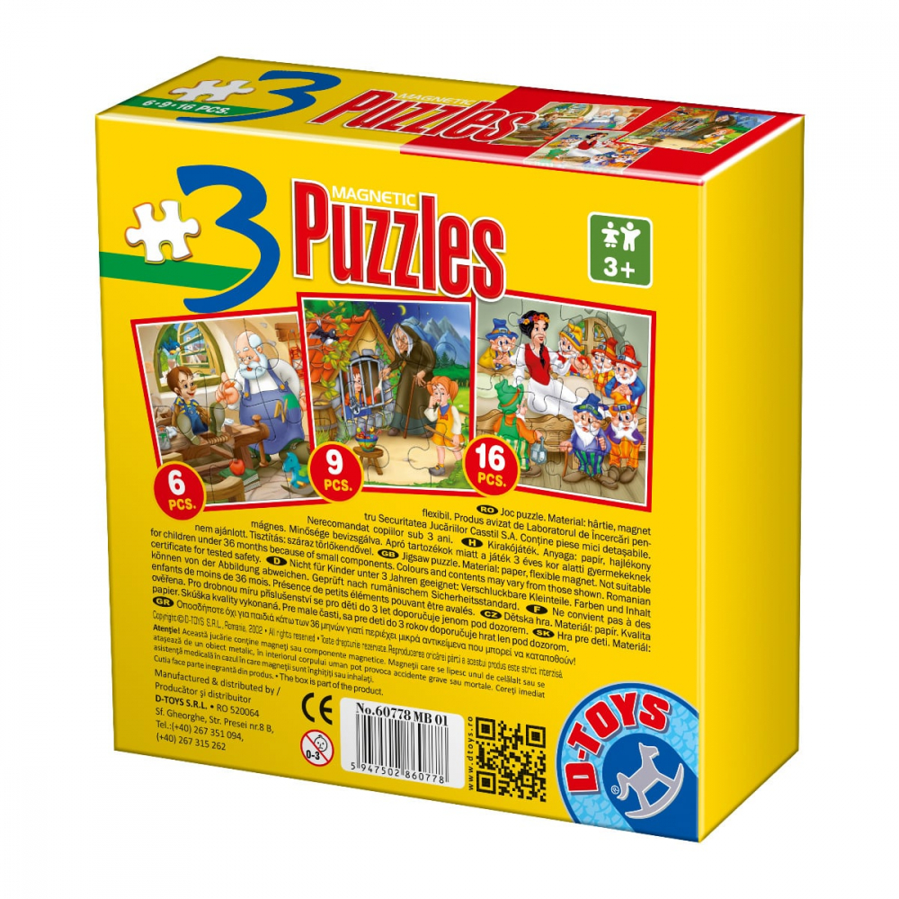 Set 3 puzzle-uri magnetice basme Hansel si Gretel, Alb ca zapada si Pinocchio de 6, 9, 16 piese