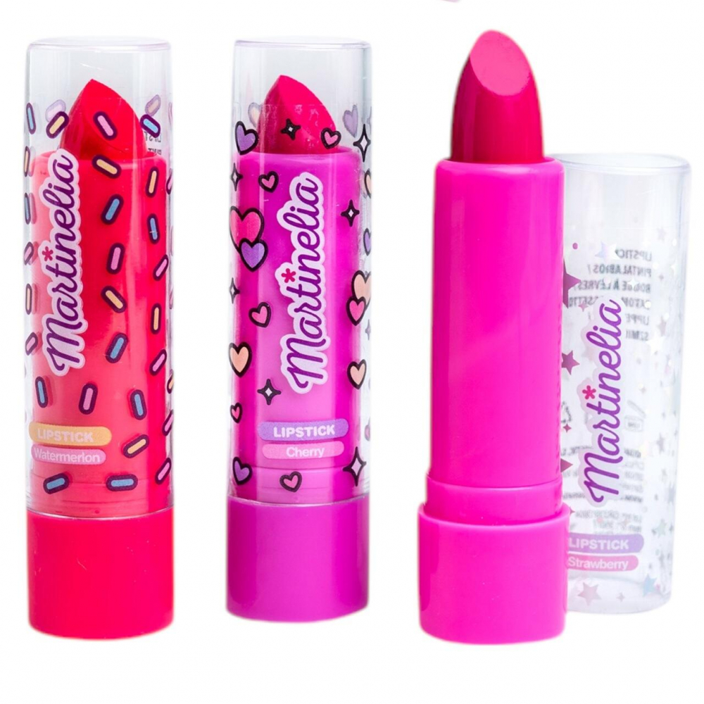 Setul Martinelia World Lipstick (cod 35077) este perfect pentru fetițele care adoră să experimenteze cu rujuri colorate și aromate. Acest set conține 3 rujuri hidratante, puse pe blistere atragatoare cu unicorn, inghetata si vulpe fiecare cu o aromă delicioasă: pepene roșu, cireșe și căpșuni. Fiecare ruj are 4 g și vine într-un ambalaj vesel, viu colorat, care atrage atenția și adaugă un strop de bucurie la rutina zilnică.