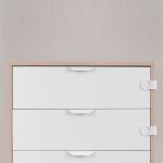 - Mecanismul de blocare cu triplu sistem de siguranta previne deschiderea nedorita de catre copii. Usor si la indemana de deschis de catre adulti cu o singura mana: doar apasati simultan cele trei butoane de siguranta si scoateti sertarul sau deschideti usa dulapului in acelasi timp.