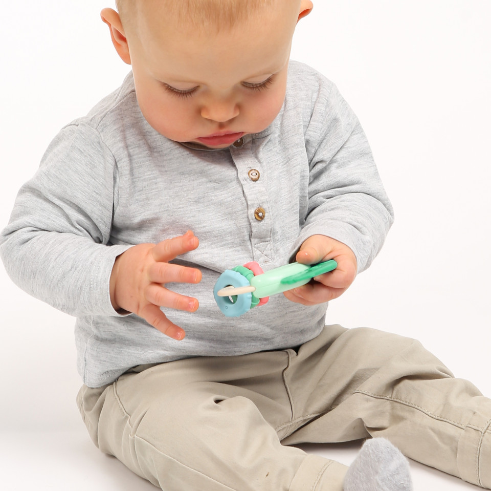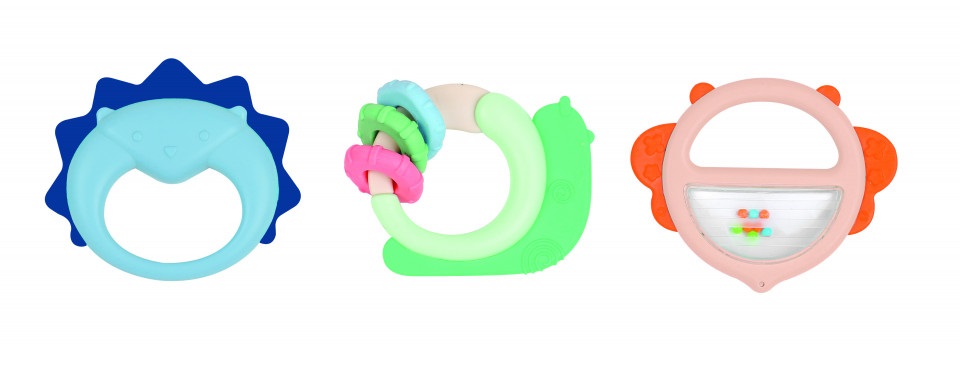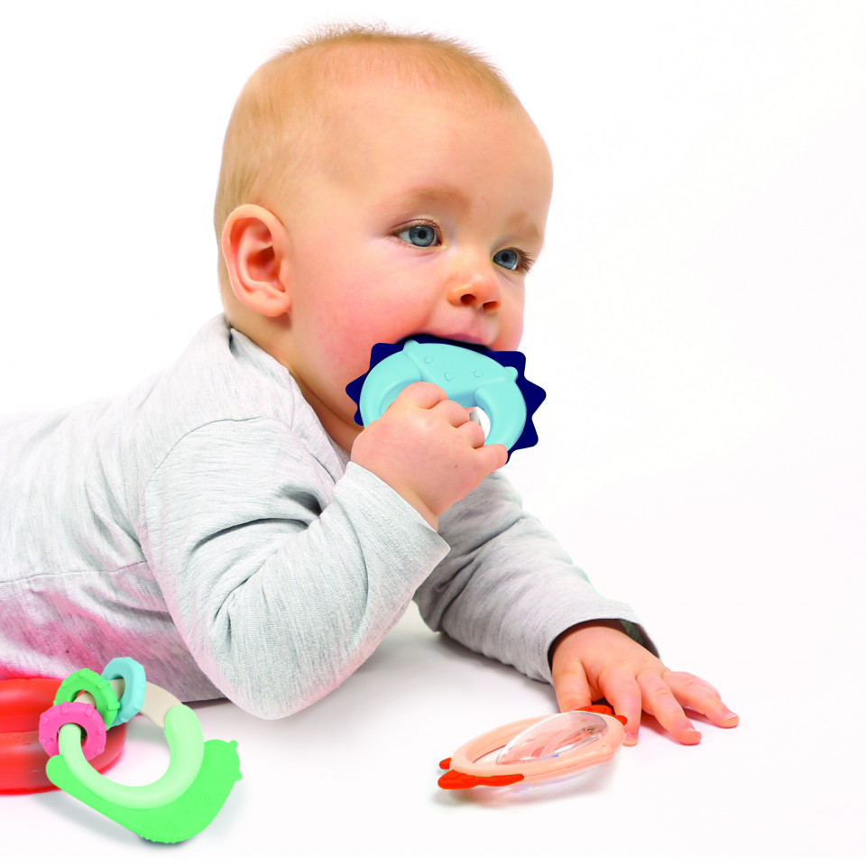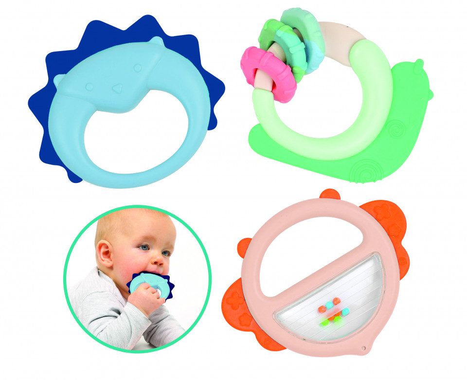 Fiecare zornaitoare are un element din plastic moale si flexibil, conceput pentru mestecat. Ele usureaza durerile gingivale provocate de aparitia dintilor. Solide, rezista cu usurinta la socuri. Aceste mici jucarii pot fi luate peste tot pentru a stimula copiii in toate circumstantele!