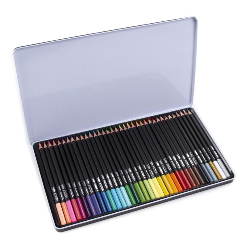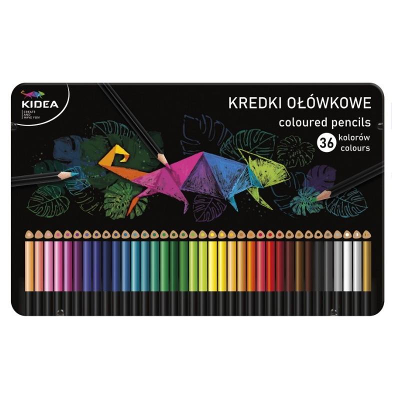 Set 36 creioane triunghiulare frumoase pentru copii cutie metal Kidea multicolore