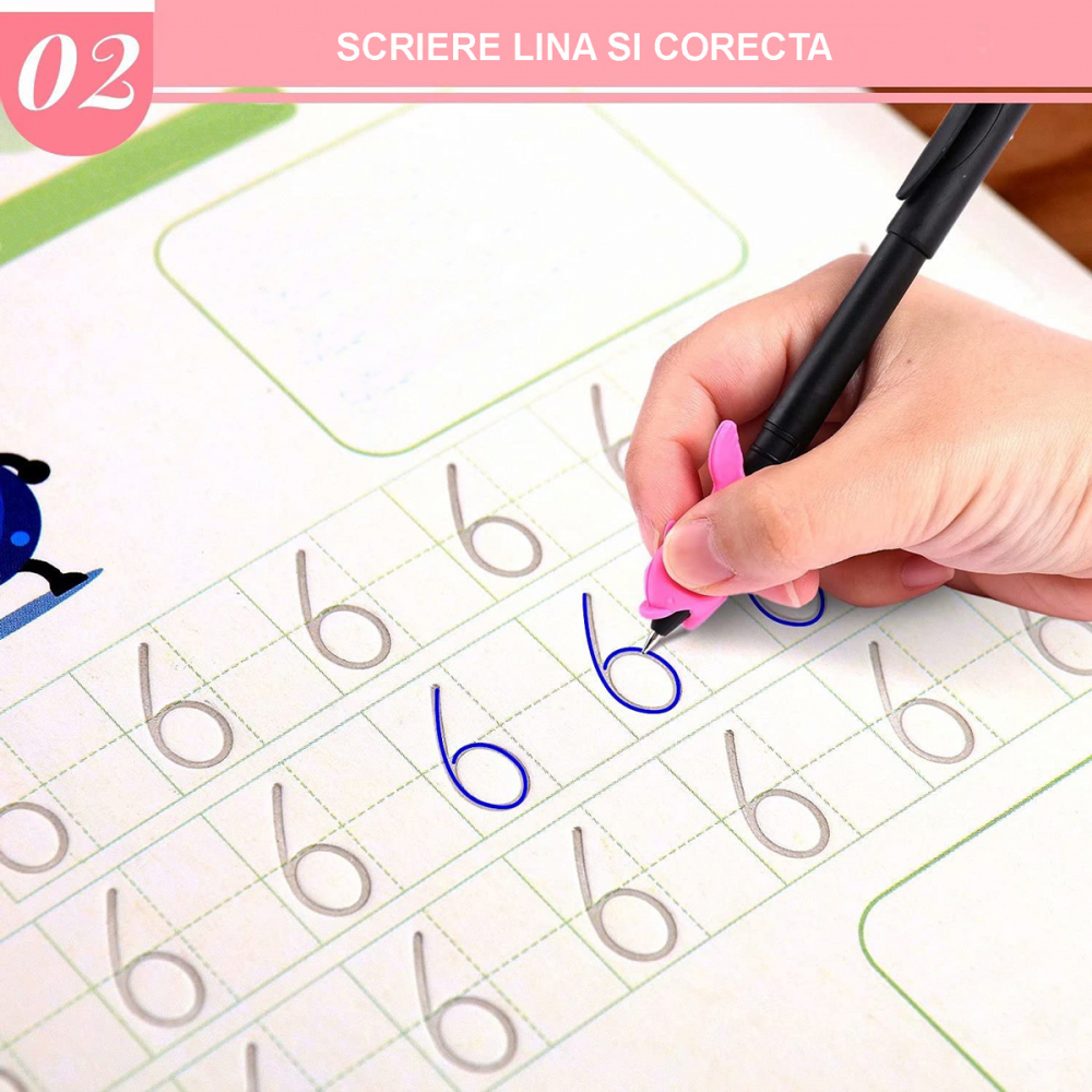 - Numele acestui produs deriva din caracteristica cea mai importanta a acestor caiete de lucru, si anume faptul ca sunt REUTILIZABILE. Utilizate impreuna cu pixul magic oferit vor putea fi folosite in mod repetat de copii dumneavostra. Scrisul va disparea in cateva minute, dupa uscare, pentru a putea exersa in mod repetat.