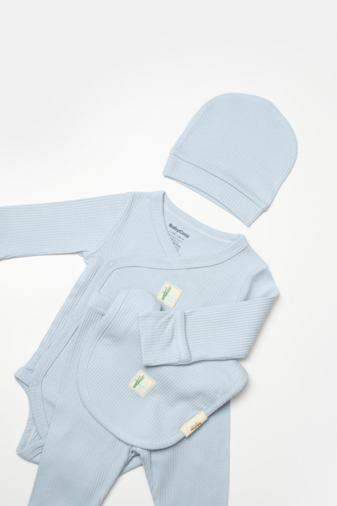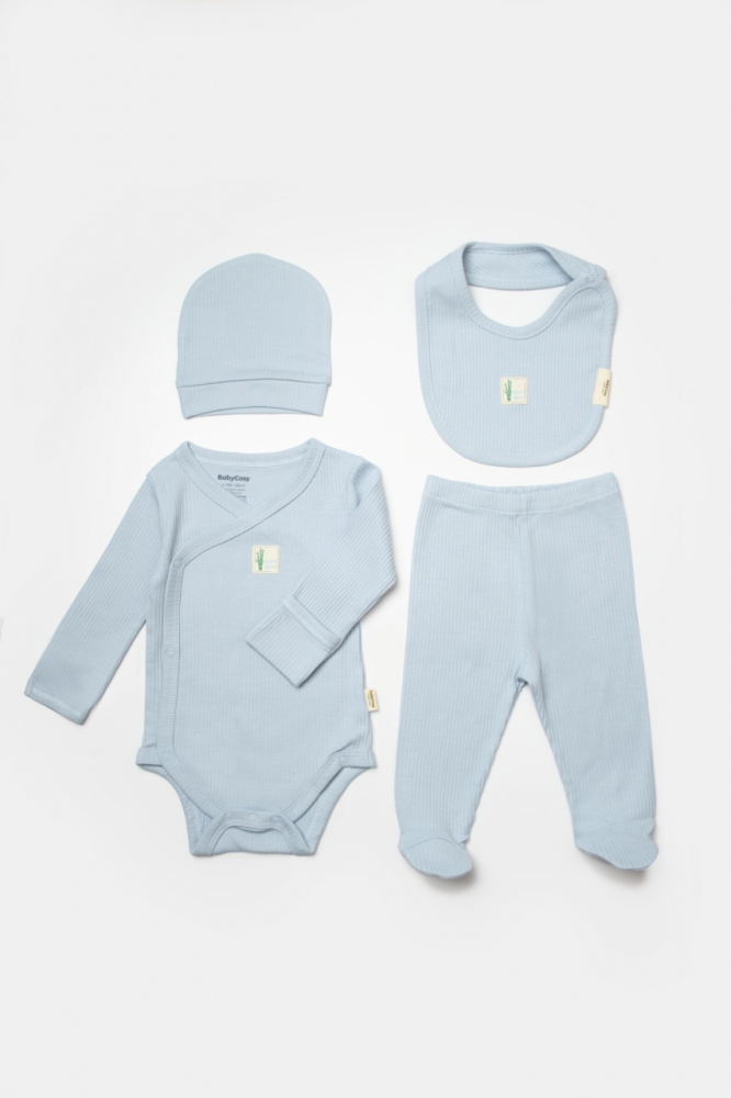 Set 4 piese body, pantaloni, baveta si caciulita Bamboo, bleu, BabyCosy, 50% bumbac + 50% bambus, marime 6-9 luni