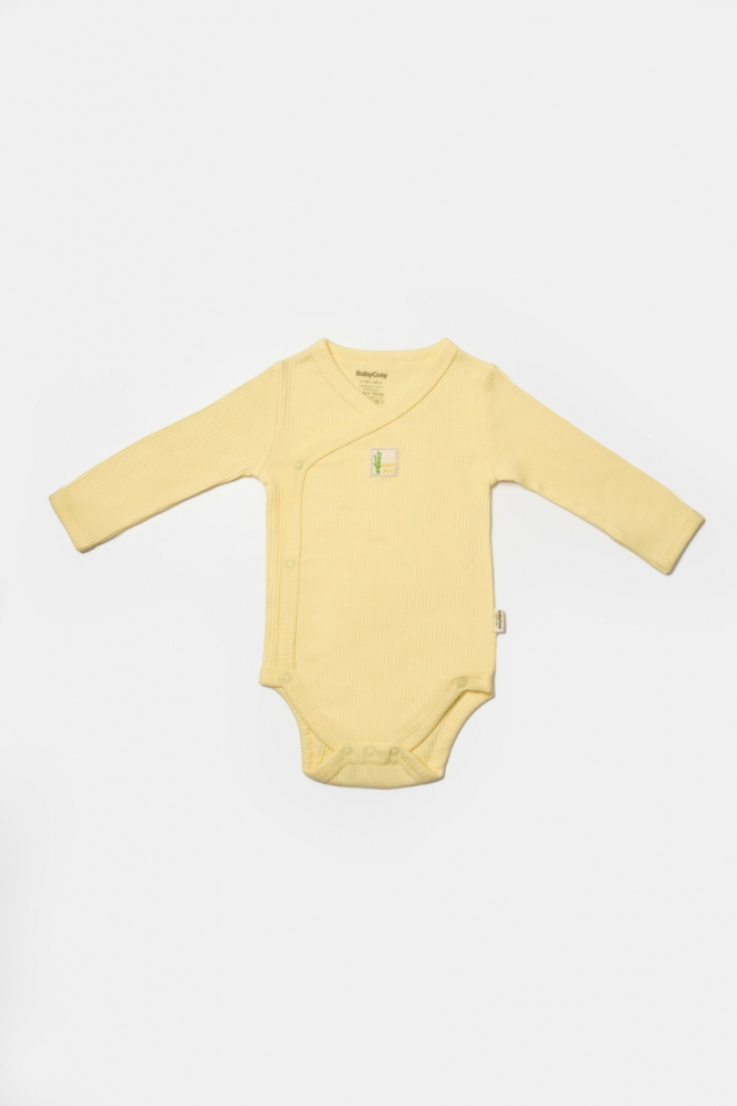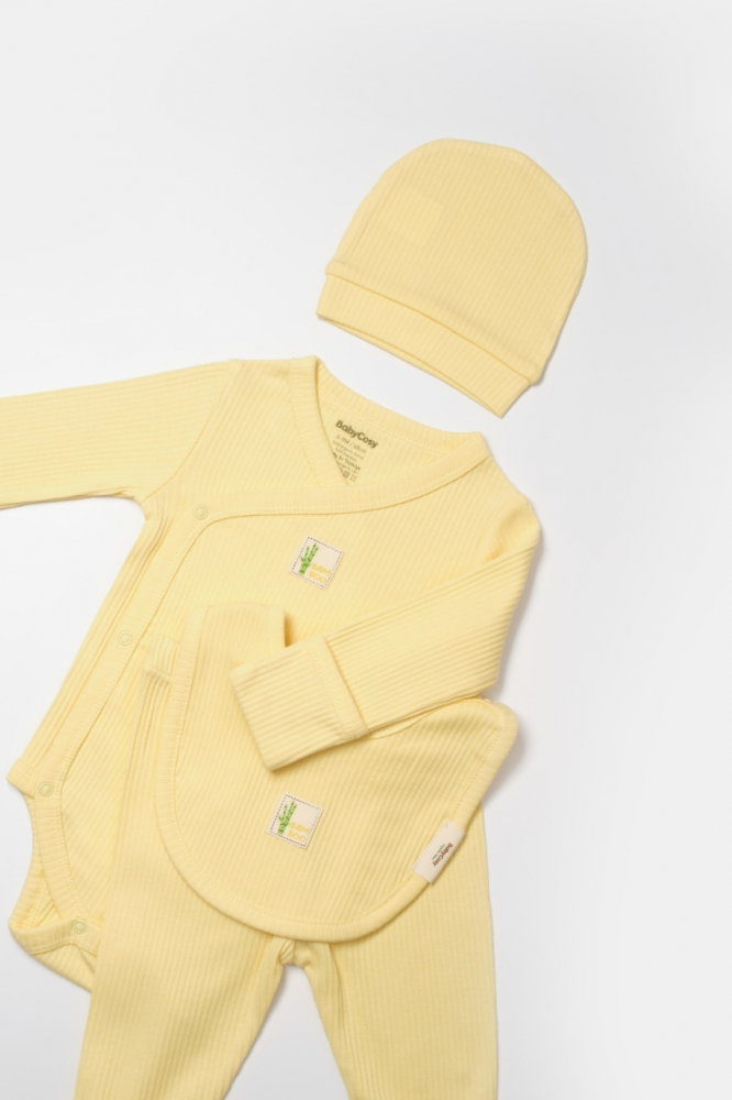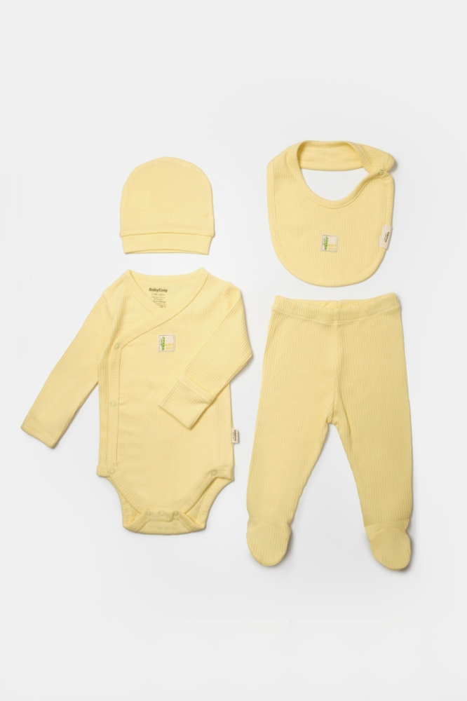 Set 4 piese body, pantaloni, baveta si caciulita Bamboo, galben, BabyCosy, 50% bumbac + 50% bambus marime 6-9 luni