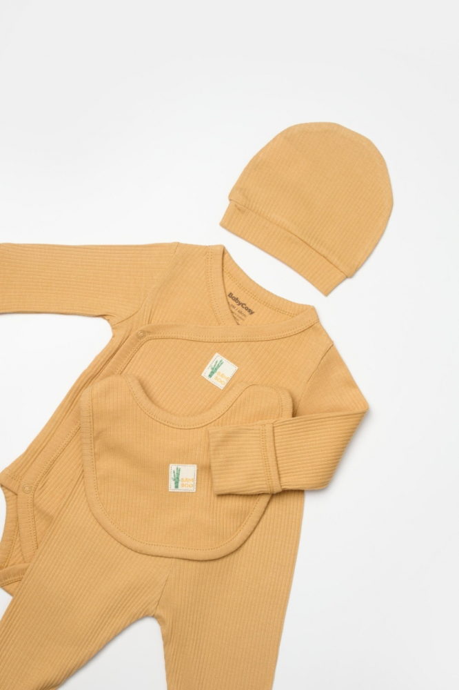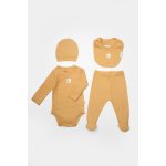 Set 4 piese body, pantaloni, baveta si caciulita Bamboo, maro, BabyCosy, 50% bumbac + 50% bambus, marime 6-9 luni