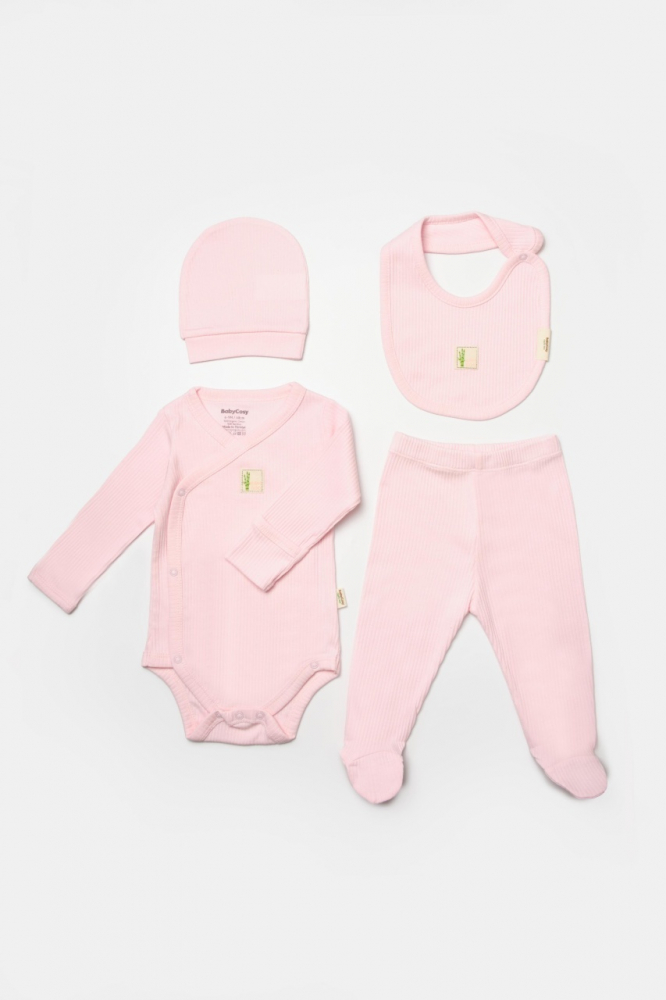 Set 4 piese body, pantaloni, baveta si caciulita Bamboo, roz, BabyCosy, 50% bumbac+ 50% bambus marime 3-6 Luni
