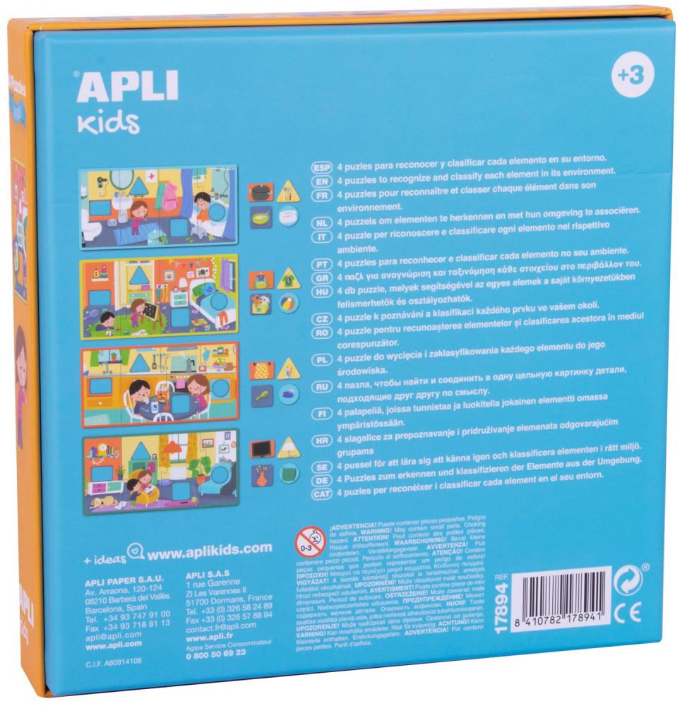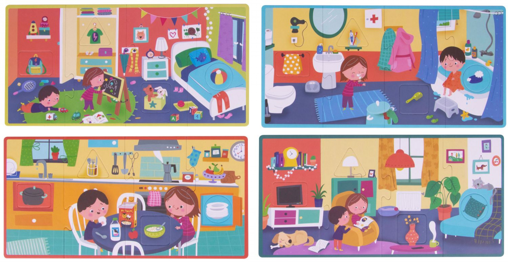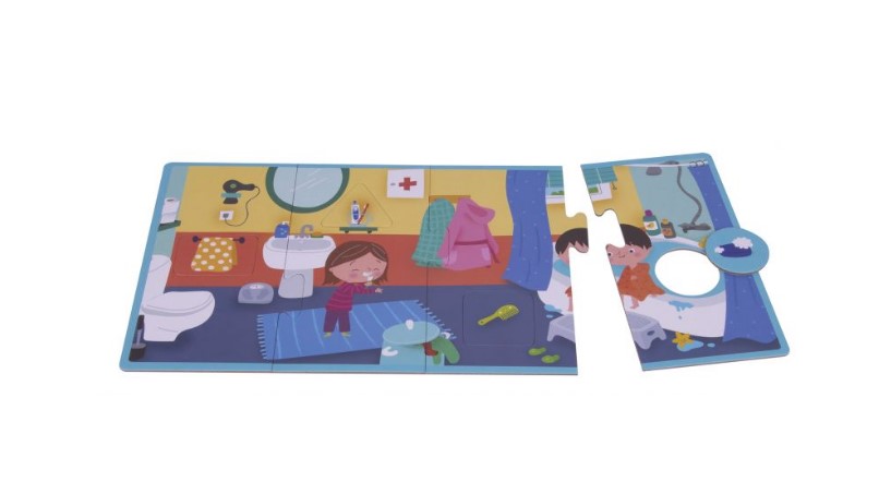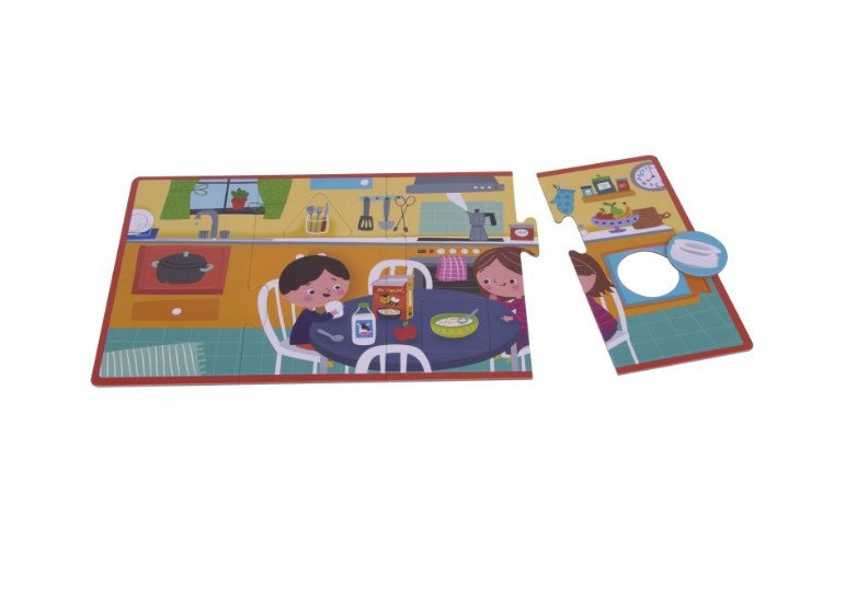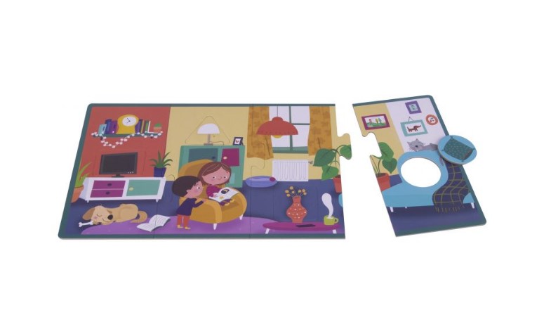 Copiii trebuie sa stabileasca puzzle-ul, sa recunoasca si sa identifice elementul in mediul sau (dormitorul, baia, bucataria si camera de zi).