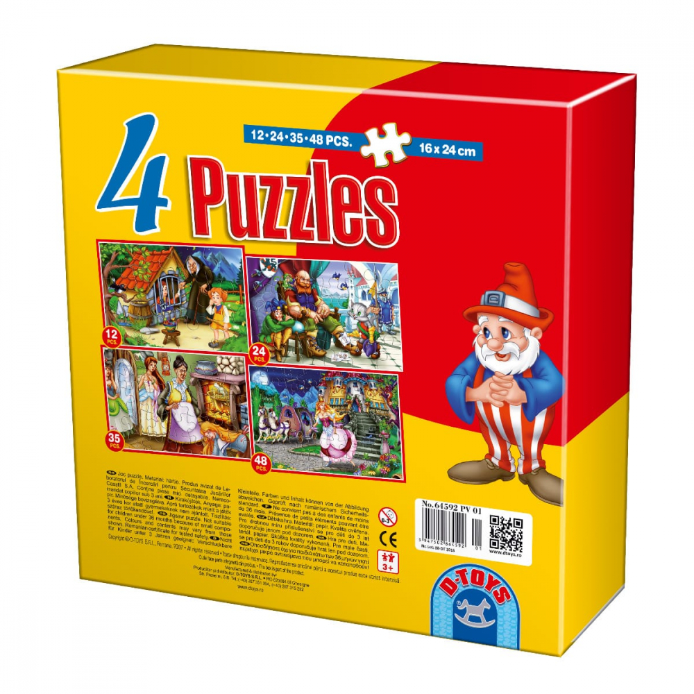 Colecția conține 4 puzzle-uri de 12, 24, 35 și 48 piese, înfățișând personaje îndrăgite din basmele clasice: Cenușăreasa (2 puzzle-uri), Motanul încălțat, Hansel și Gretel.