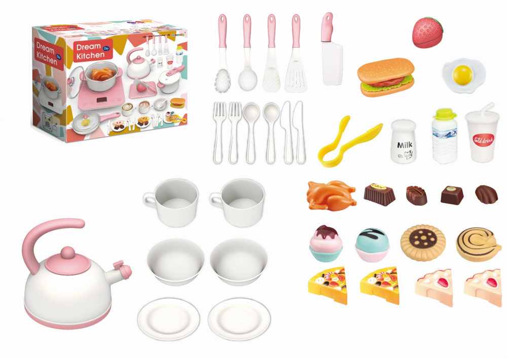 Set 44 accesorii pentru gatit Doris Dream Kitchen cu alimente,vesela si tacamuri incluse