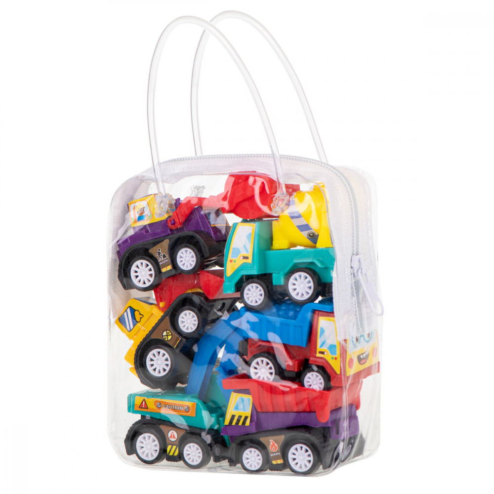 Set 6 masinute de constructie pentru copii, Ikonka, cu mecanism pull-back, realizate din plastic, in husa de transport cu fermoar, multicolor