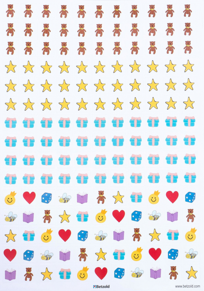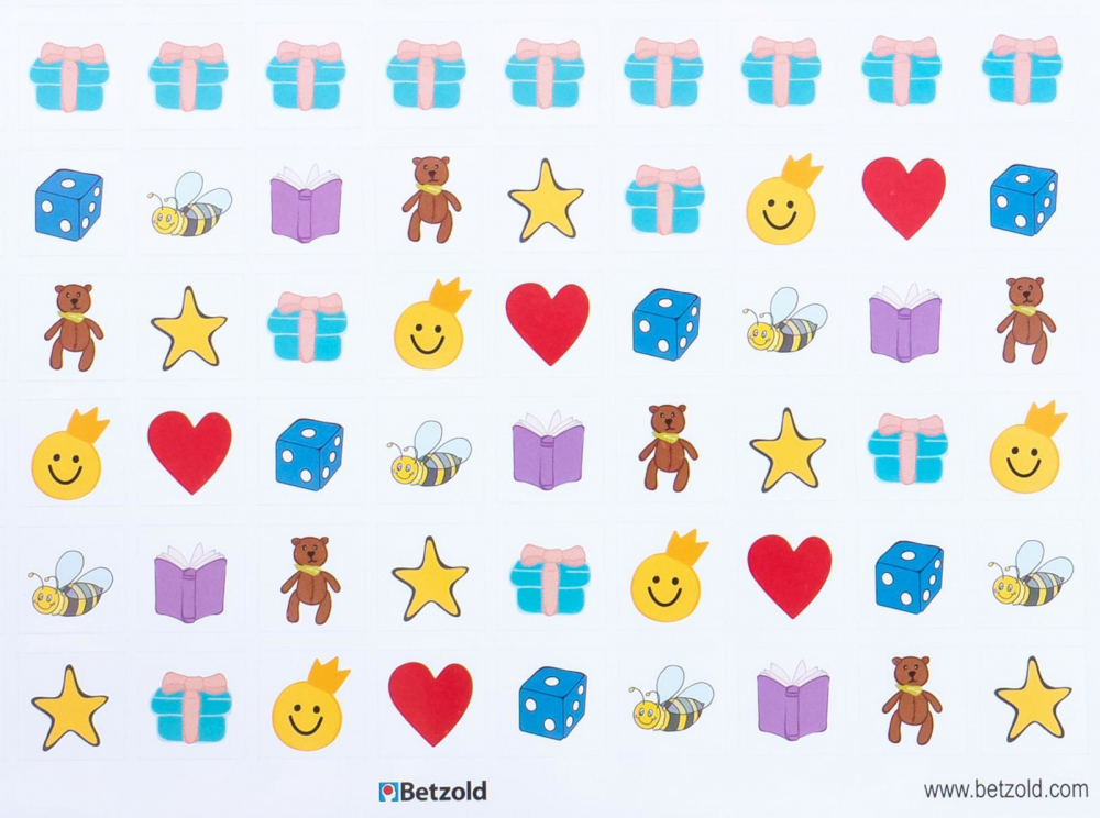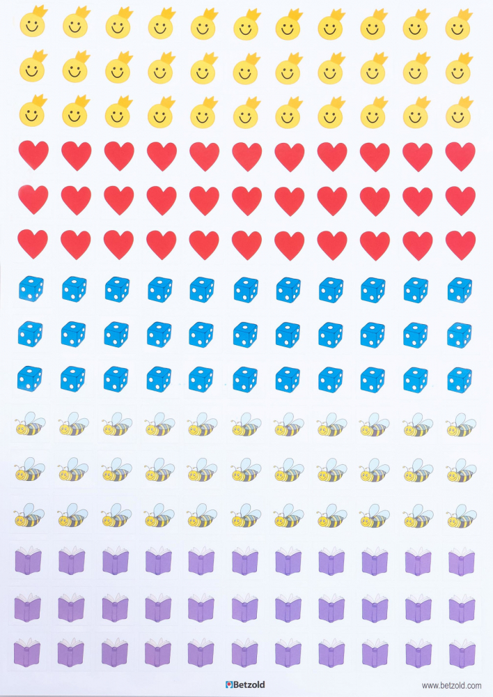 Simbolurile care apar sunt: inimă, albinuță, cometă, zar, carte, ursuleț, stea, pachet cadou.