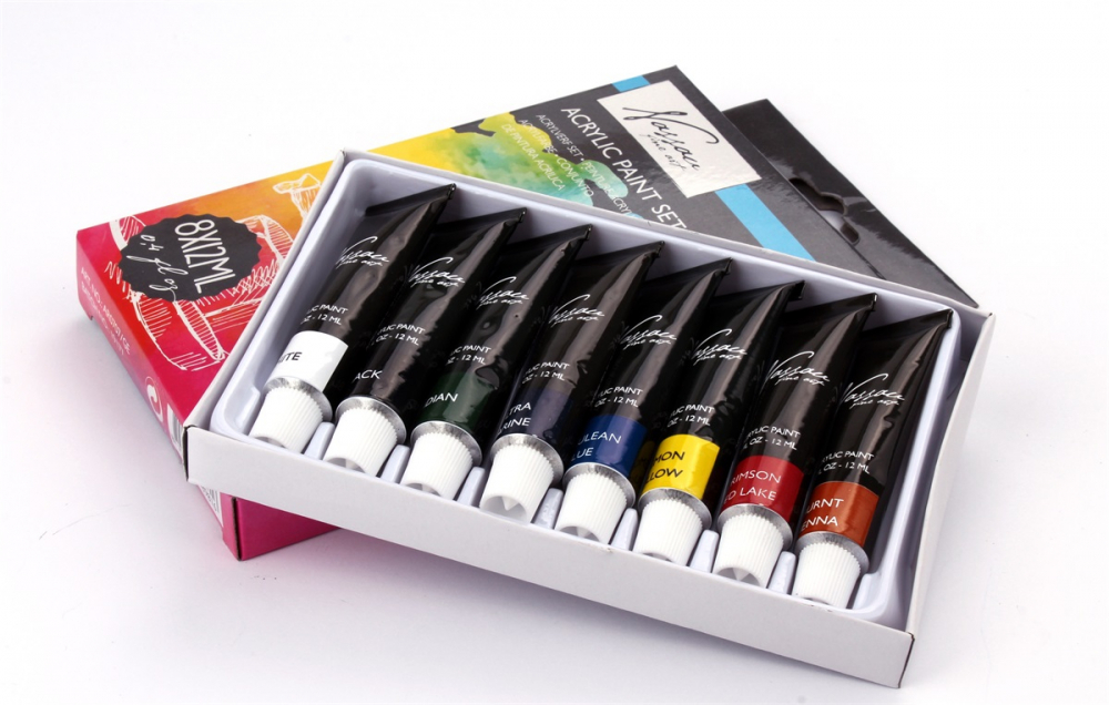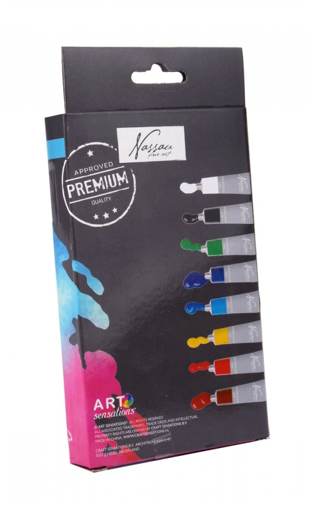 Setul de culori acrilice Nassau Fine Art include 8 nuante vibrante, ambalate in recipiente de 12 ml fiecare, ideale pentru orice proiect artistic.