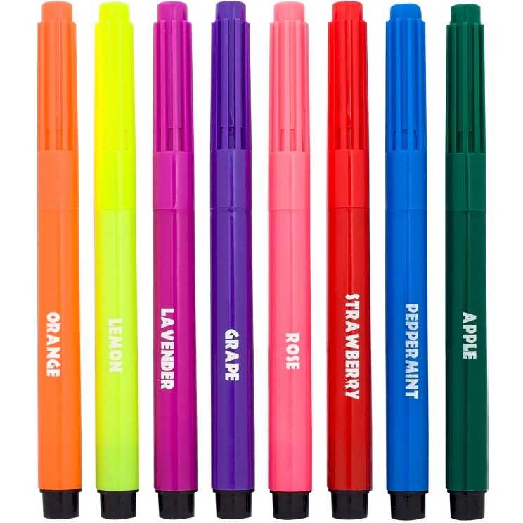 Pe langa culorile vibrante, cele 8 markere au toate mirosuri diferite: portocala, lamaie, lavanda, strugure, trandafir, capsuna, menta si mar.