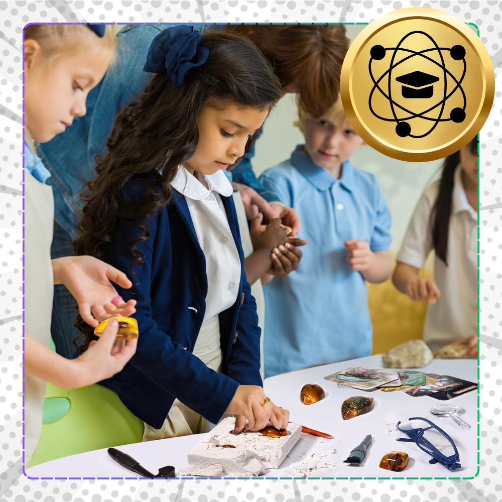 - Joc activ: Spargerea unei fosile cu ciocanul si dalta dezvolta abilitatile manuale, coordonarea ochi-mana si rabdarea.