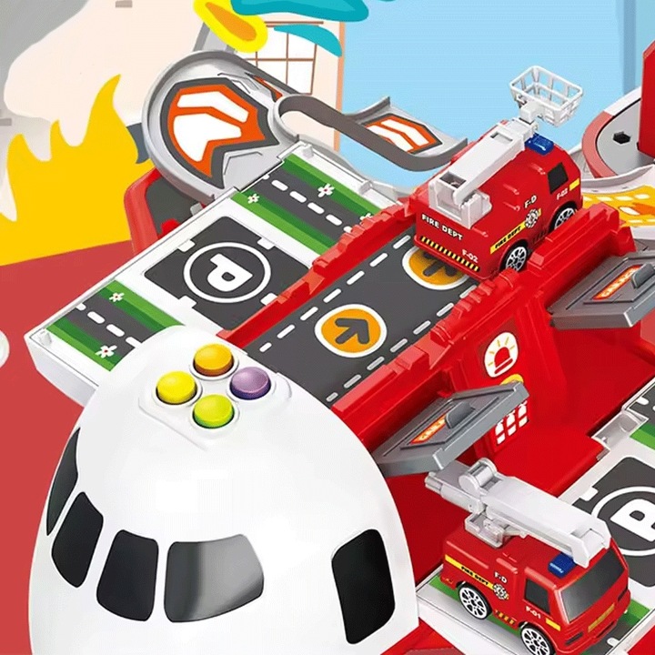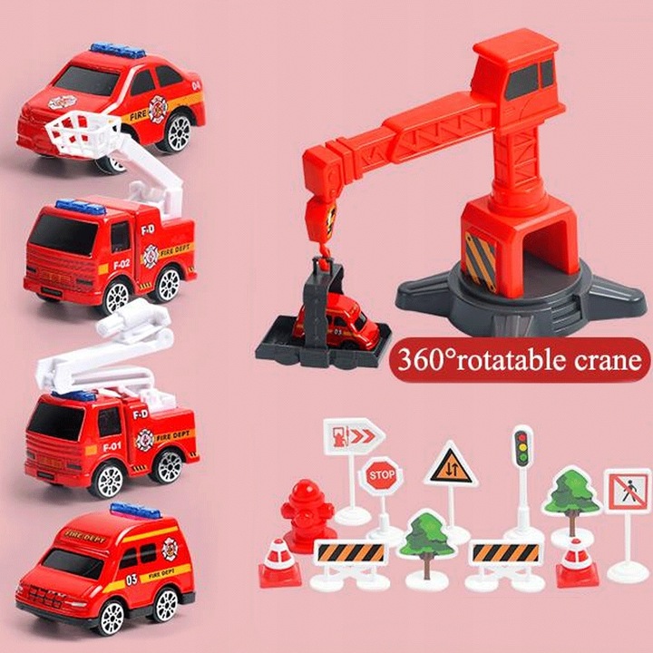 Set Avion interactiv cu sunete lumini Macara mobila si 4 masinute metalice Brigada de pompieri