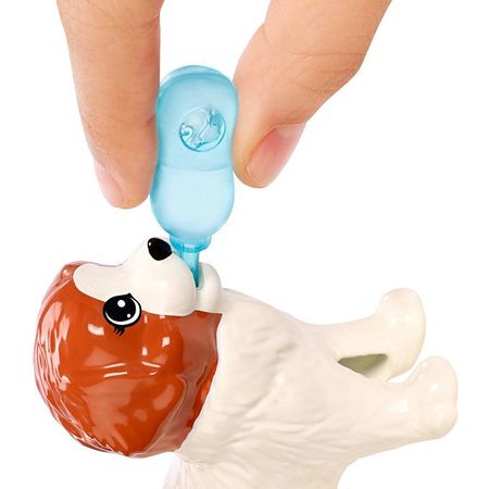 Setul de joaca include papusa Barbie, doi catei mai mari, doi mai mici, o sticluta pentru apa, un castronel pentru mancare, trei oase, o paturica si un ziar ce isi schimba culoarea la contactul cu apa