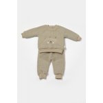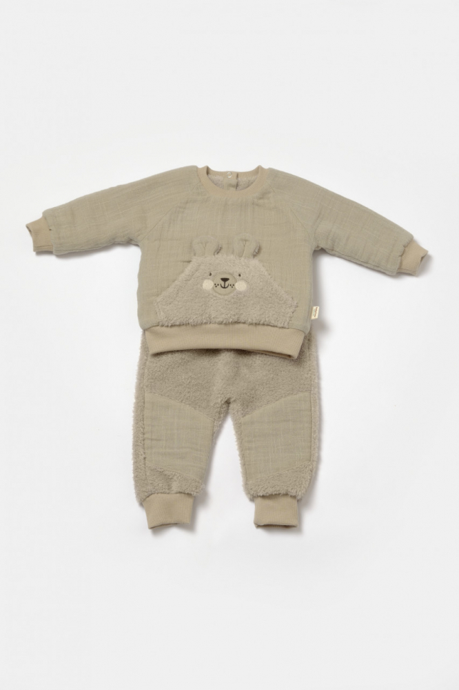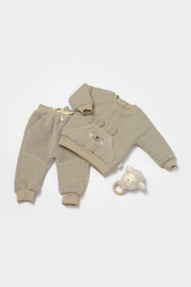 Set bluza cu buzunar si pantaloni Ursulet Winter muselin 100% bumbac dublat Verde BabyCosy 9-12 luni