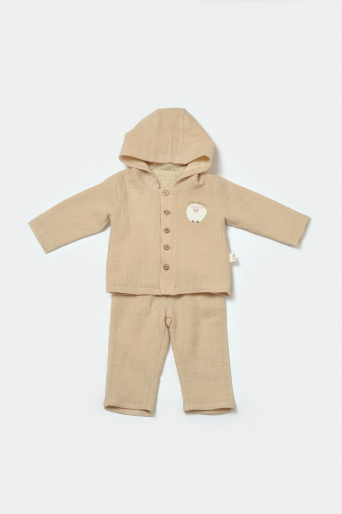 Set bluza cu gluga si pantaloni Winter muselin 100% bumbac Apricot BabyCosy 6-9 luni