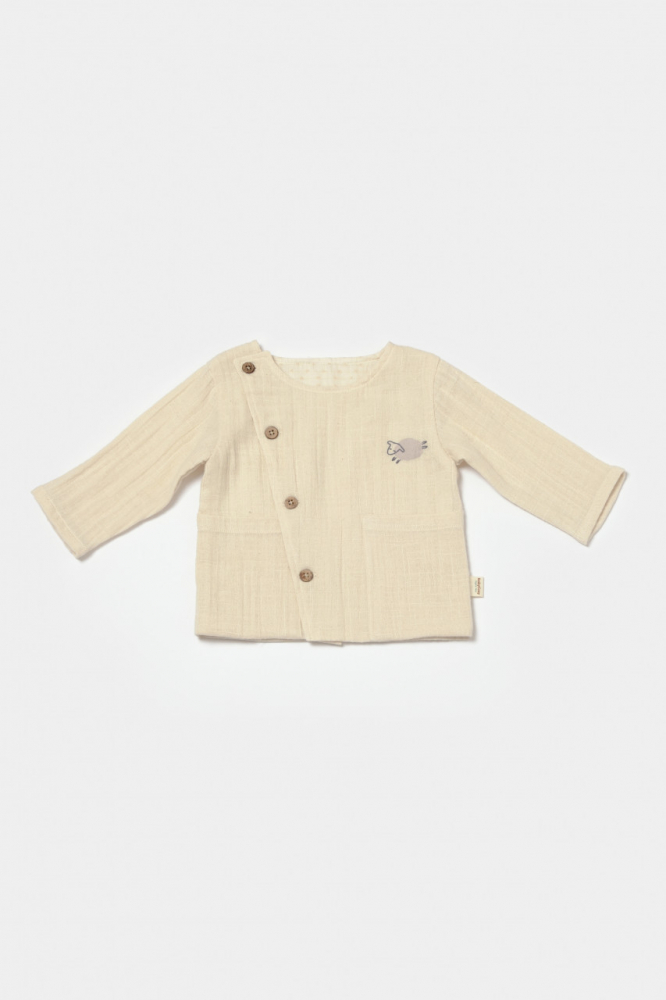 2. Bluza cu maneci lungi, din 100% bumbac - muselina are un imprimeu haios cu oita pe piept. Materialul este dublat oferind un plus de confort si fiind setul perfect pentru zilele mai friguroase. Aceasta se inchide cu nasturei.