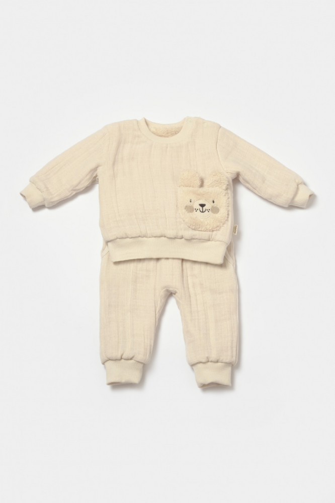 Set bluza dublata si pantaloni Ursulet Winter muselin 100% bumbac Stone BabyCosy 9-12 luni