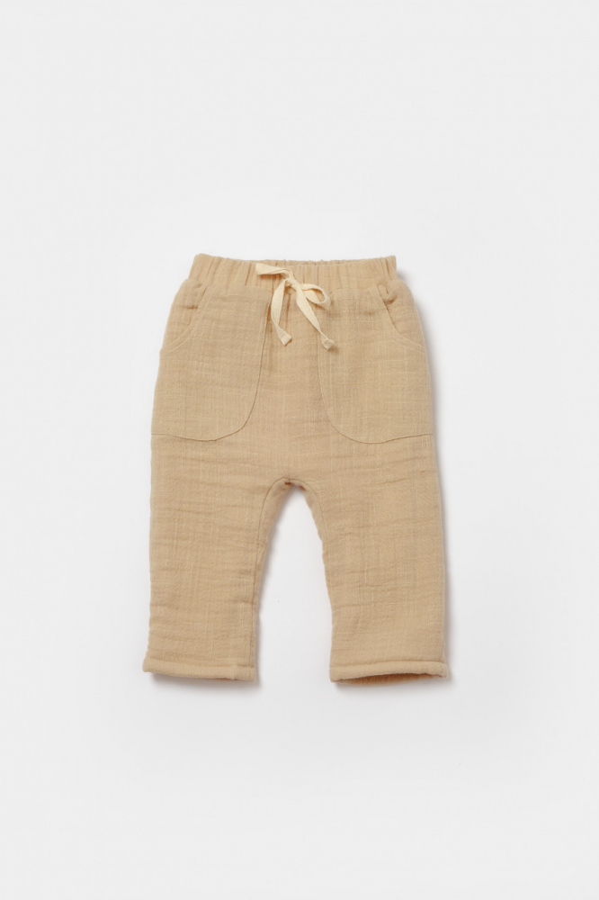1. Pantalonasi din 100% bumbac - muselina delicat cu pielea gingasa a a bebelusului. Acestia au talia elastica si foarte confortabila. Sunt prevazuti cu un snur decorativ decorativi