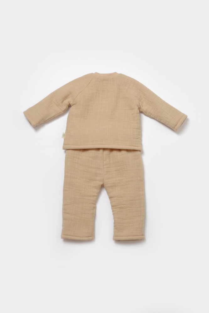 Set bluza dublata si pantaloni Winter muselin 100% bumbac Apricot BabyCosy 3-6 Luni