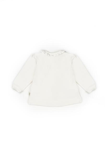 Bluzița este decorată cu guler cu volănaș, are capse în partea din față pentru îmbrăcare rapidă și ușoară, iar pe piept este imprimată o fundiță delicată.