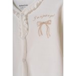 Bluzița este decorată cu guler cu volănaș, are capse în partea din față pentru îmbrăcare rapidă și ușoară, iar pe piept este imprimată o fundiță delicată.